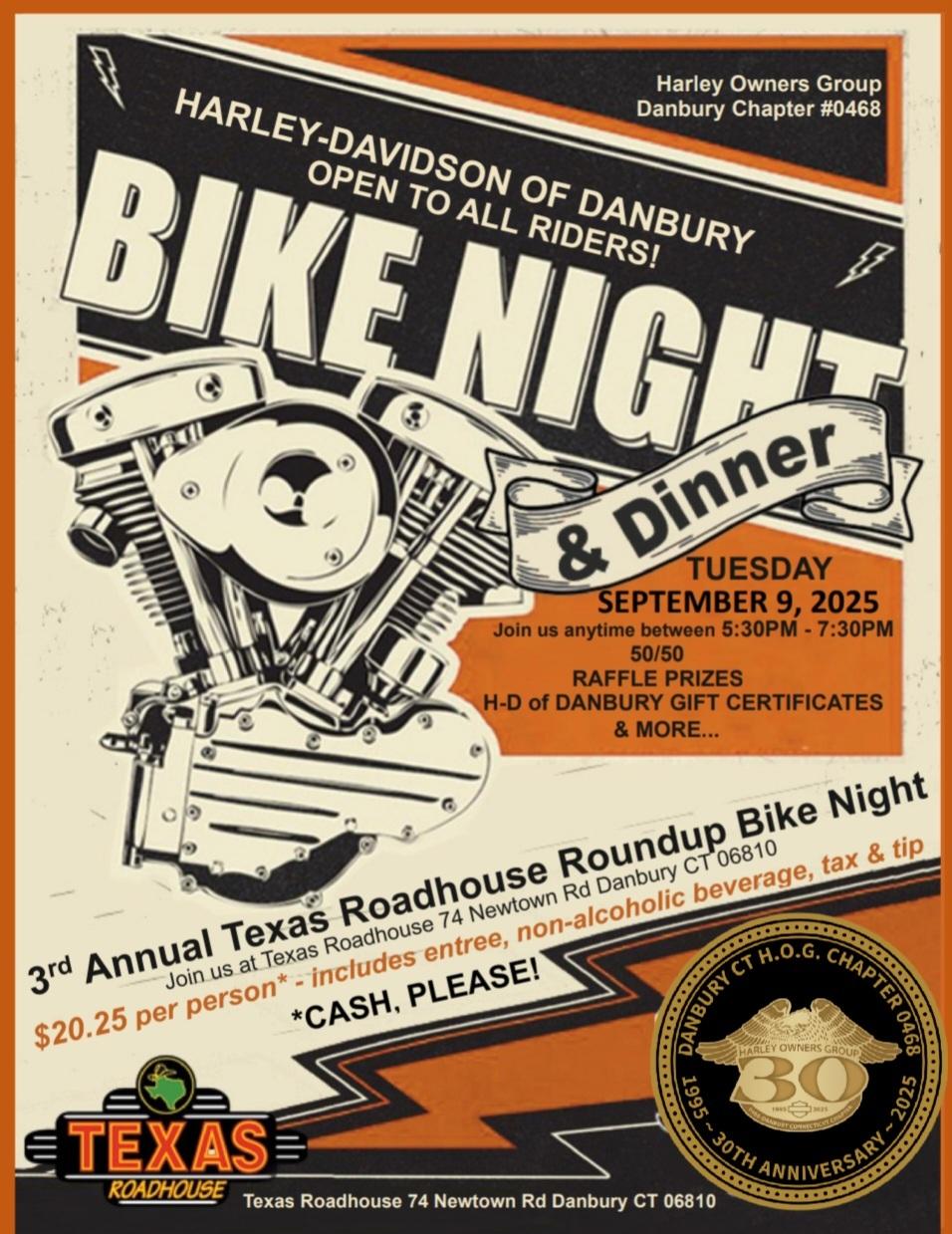 3rd Annual Texas Roadhouse Bike Night & Dinner - Tuesday, September 9, 2025